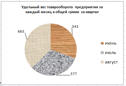 Следующий шаг предполагает определение диапазона построения диаграммы. В данной задаче необходимо построить диаграмму по итоговой строке. Для этого выделите ячейки по строке Итого, содержащие итоговые значения товарооборота по каждому месяцу (В10:D10). Затем выделите ячейки «шапки» таблицы, содержащие названия периодов (В5:D5). Для этого нажмите клавишу CTRL и, не отпуская ее, выделите необходимые ячейки. Таким образом, получите диапазон для построения диаграммы в виде двух выделенных строк, находящихся в разных частях таблицы. Далее на ленте главного меню выбрать вкладку ВСТАВКА, ДИАГРАММА, КРУГОВАЯ. Появится диаграмма, щелкните на ней правой кнопкой мыши и выберите команду ДОБАВИТЬ ПОДПИСИ ДАННЫХ. Напротив каждого сектора появилось значение в рублях. Задайте имя диаграмме Удельный вес товарооборота предприятия за каждый месяц в общей сумме за квартал. Для этого щелкните по диаграмме правой кнопкой мыши и выберите команду ВЫБРЫТЬ ДАННЫЕ, и в левой части диалогового окна ЭЛЕМЕНТЫ ЛЕГЕНДЫ (РЯДЫ) измените название ряда. Диаграмма готова (рисунок 3).