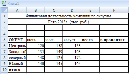 Цель работы: освоение простейших приемов работы в приложении Microsoft Excel и способов графического отображения полученных результатов. Задание. Проанализируйте финансовую деятельность компании за 3 месяца 2013г. по округам в среде MS Excel. Исходные данные показаны в таблице 1. Рассчитайте значения столбцов Всего, В процентах (удельный вес товарооборота каждого округа в общей сумме товарооборота) и строки Итого. Постройте круговую диаграмму по итоговым данным деятельности компании, постройте гистограммы для округов за каждый месяц и по столбцу Всего [1]. Таблица 1 – Исходные данные по финансовой деятельности компании