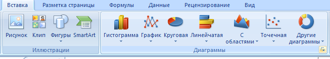 Графическое представление данных Программа Microsoft Еxcel располагает большим количеством вариантов графического представления данных. Это диаграммы, гистограммы, графики и различные их модификации, предназначенные для более наглядного представления информации. Для того, чтобы построить диаграмму необходимо на ленте главного меню выбрать вкладку ВСТАВКА, ДИАГРАММА (рисунок 2). Рисунок 2 – Состав вкладки ВСТАВКА
