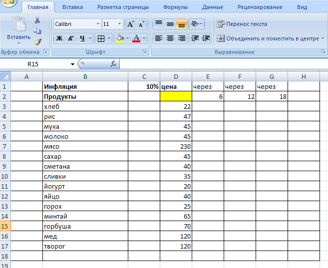 Задача 1. В целях покупки недвижимости инвестор взял в банке кредит в сумме 12 млн. руб. Используя Таблицу данных, определить ежемесячные выплаты по кредиту для разных процентных ставок и сроков погашения кредита. Задача 2. Создайте таблицу предполагаемых цен на основные продукты питания через 6, 12 и 18 месяцев (рисунок 56). Инфляция составляет 10% в год. Цены заданы на текущее число. Цену товаров с учетом инфляции вычисляйте по формуле сложных процентов (функция БС). Расчет производите с помощью таблицы данных.