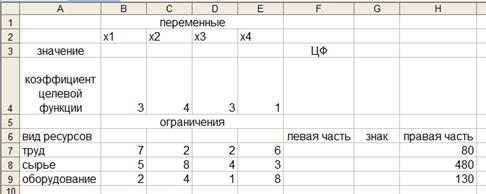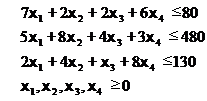 Пример 2. Фабрика имеет в своем распоряжении определенное количество ресурсов: рабочую силу, деньги, сырье, оборудование, производственные площади и т. п. Допустим имеются ресурсы трех видов рабочая сила, сырье и оборудование в количестве соответственно 80 (чел/дней), 480 (кг), 130 (станко/часов). Фабрика может выпускать ковры четырех видов. Информация о количестве единиц каждого ресурса необходимых для производства одного ковра каждого вида и доходах, получаемых предприятием от единицы каждого вида товаров, приведена в таблице на рисунке 60. Требуется найти такой план выпуска продукции, при котором общая стоимость продукции будет максимальная.