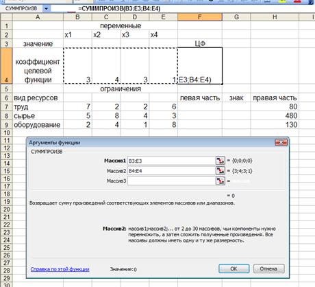 Рисунок 61 - Ввод исходных данных Ввод зависимости для целевой функции § Вызвать Мастер функций fx на панели инструментов Выбрать категорию Математические. § Выбрать функцию СУММПРОИЗВ. § В массив 1 ввести B3:E3. § В массив 2 ввести B4:E4. Готово.