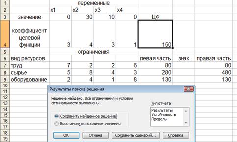Рисунок 62 - Ввод формул для решения задачи Ввод зависимостей для ограничений F7=СУММПРОИЗВ(В3:Е3,В7:Е7) F8=СУММПРОИЗВ(В3:Е3,В8:Е8) F9=СУММПРОИЗВ(В3:Е3,В9:Е9) Запуск Поиск решения После выбора команд ДАННЫЕ/ПОИСК РЕШЕНИЯ появится диалоговое окно Поиск решения. В диалоговом окне Поиск решения есть три основных параметра: Установить целевую ячейку; Изменяя ячейки; Ограничения. При назначении целевой функции и изменяемых ячеек необходимо установить Курсор в поле Установить целевую ячейку / Ввести адрес $F$4 / Ввести направление целевой функции: Максимальному значению / Курсор в поле Изменяя ячейки/ Ввести адреса В$3:E$3. При вводе ограничений необходимо установить Курсор в поле Добавить / Появится диалоговое окно Добавление ограничения / После ввода последнего ограничения ввести ОК. При вводе параметров для решения ЗЛП: Открыть окно Параметры поиска решения / Установить флажок Линейная модель / Установить флажок Неотрицательные значения / ОК / Выполнить. Полученное решение (рисунок 63) означает, что максимальный доход 150 тыс. руб. фабрика может получить при выпуске 30 ковров второго вида и 10 ковров третьего вида. При этом ресурсы труд и оборудование будут использованы полностью, а из 480 кг пряжи (ресурс сырье) будет использовано 280 кг.